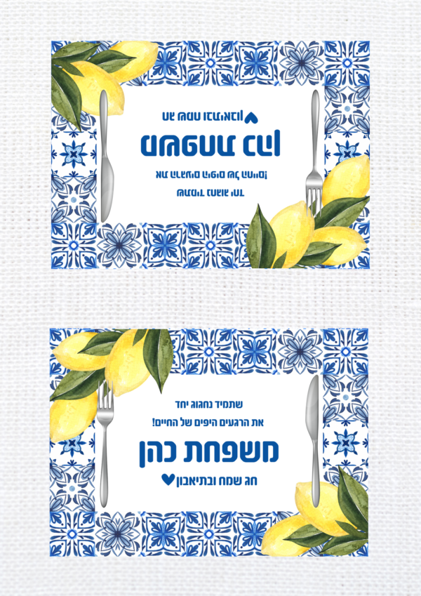 כל פלייסמט מעוצב בהתאמה אישית עם שם המשפחה שלכם, ומשלב אלמנטים מהעולם הסיציליאני – לימונים, עלי זית ודוגמאות שיסחפו את האורחים שלכם היישר לאי קסום באירופה.