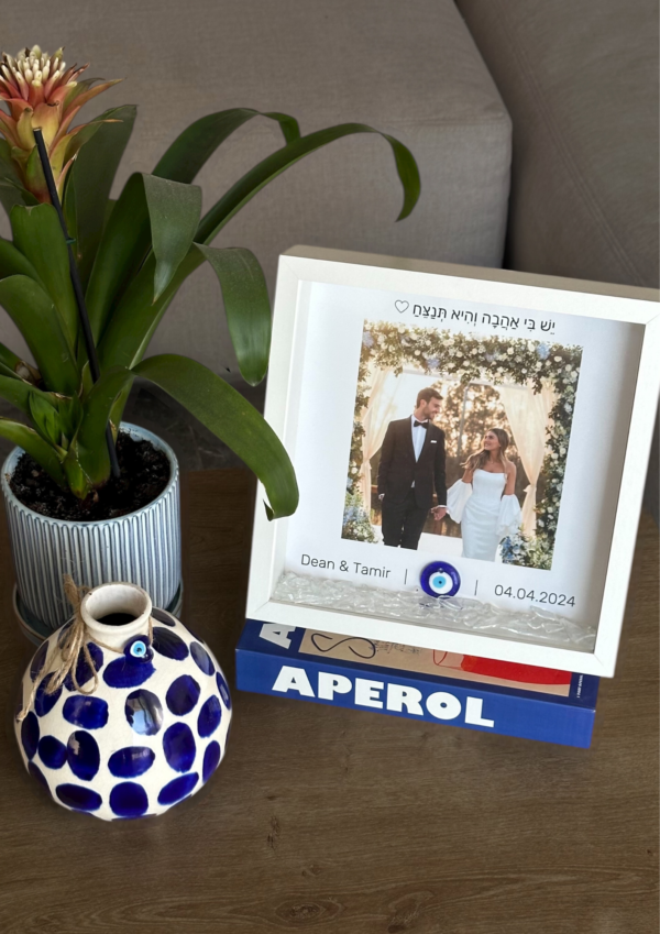 הכנו בשבילכם מזכרת מיוחדת שאוצרת בתוכה שני זיכרונות יקרים: התמונה שמספרת את סיפור האהבה שלכם, ומתחתיה – שברי הכוס המקודשים מהרגע בו הבטחתם זה לזו נצח.