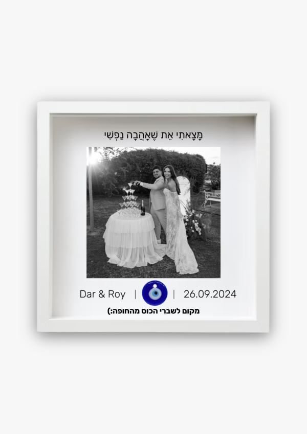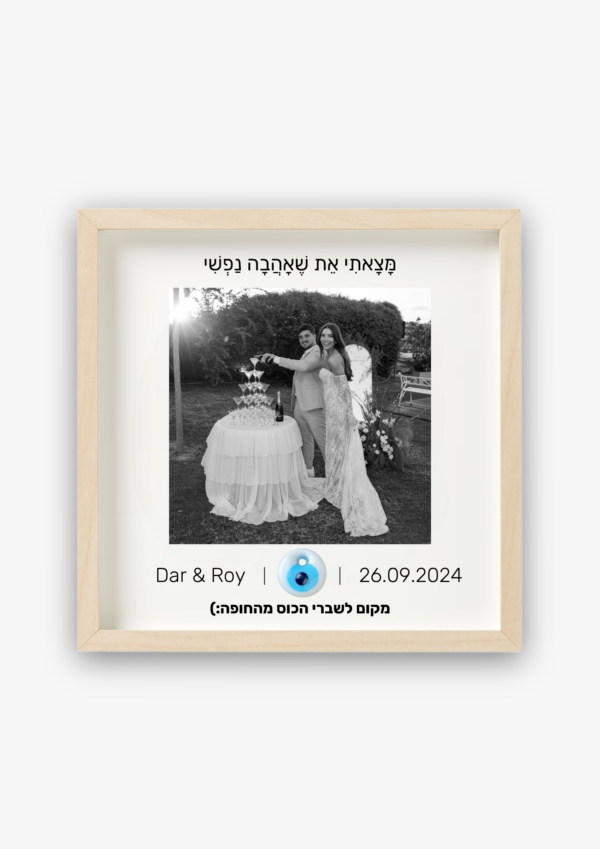 הכנו בשבילכם מזכרת מיוחדת שאוצרת בתוכה שני זיכרונות יקרים: התמונה שמספרת את סיפור האהבה שלכם, ומתחתיה – שברי הכוס המקודשים מהרגע בו הבטחתם זה לזו נצח.